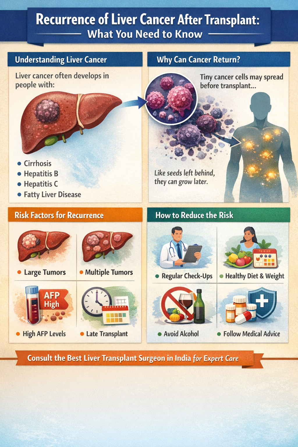 Think of a liver transplant like replacing the engine of a car. The new engine may work perfectly, but if the conditions that caused the original damage still exist, problems can sometimes return. In the same way, certain factors can allow cancer cells to reappear even after transplant surgery.